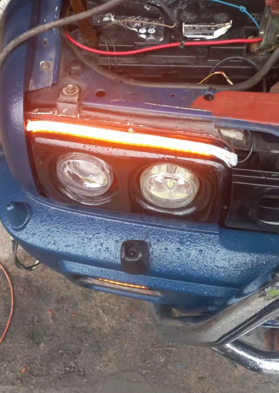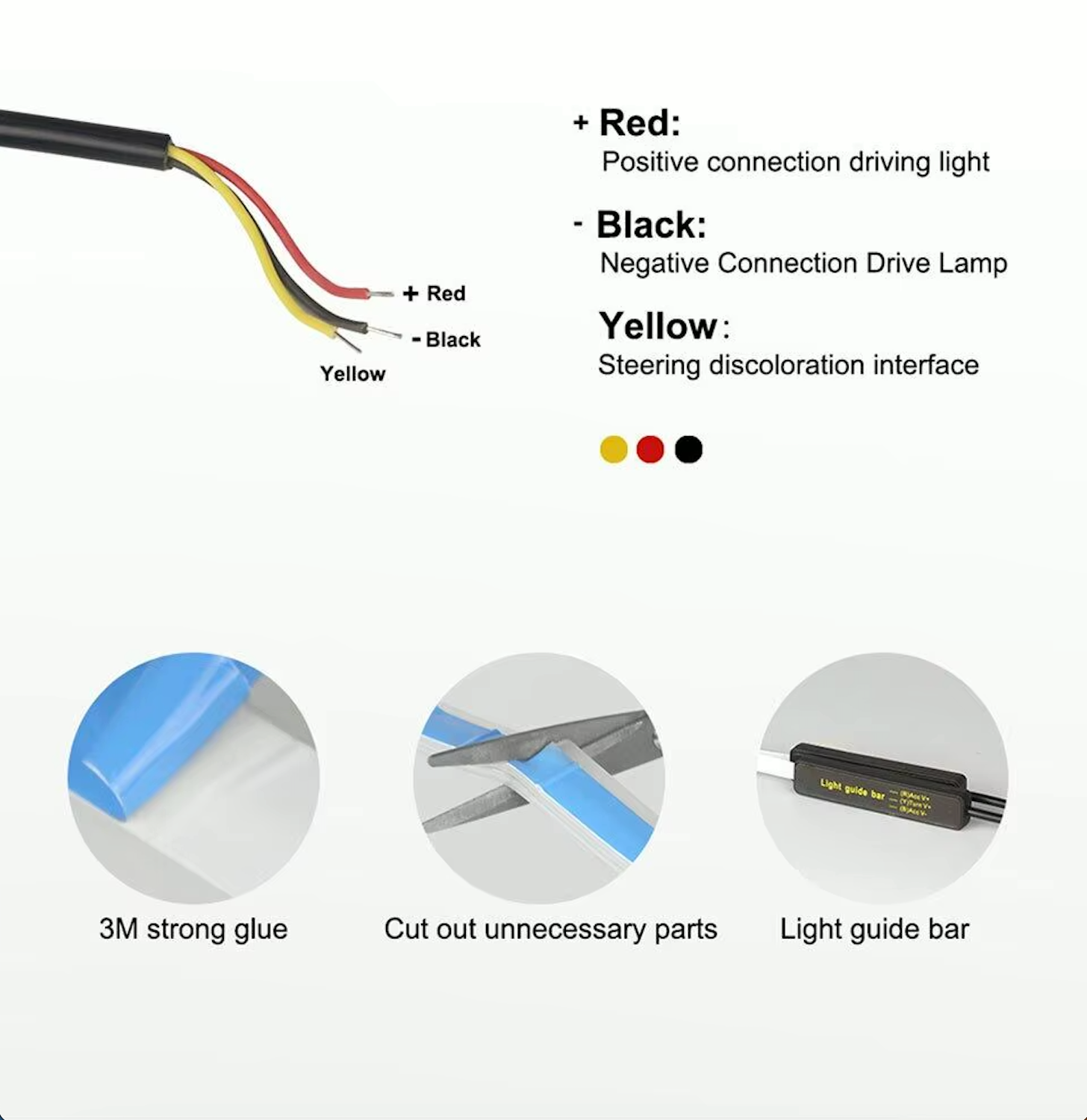 ثلاثة أسلاك: أسود (الأرضي)، أحمر (أضواء نهارية بيضاء)، أصفر (مؤشرات برتقالية).